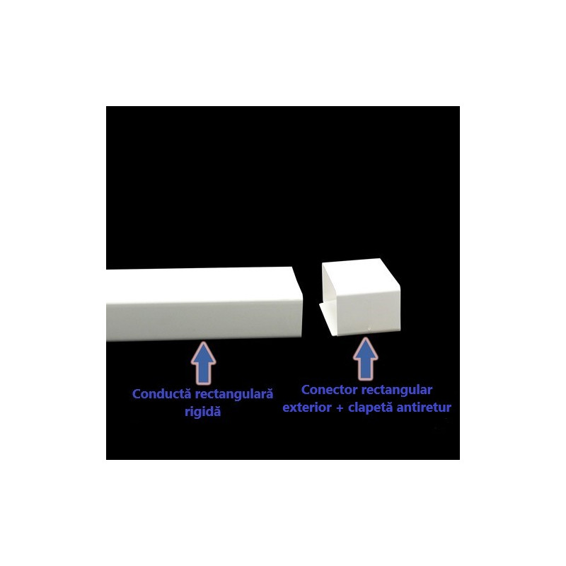 Conector exterior plastic este folosit pentru, conectarea conductelor de dimensiune 204x60 mm, este echipat cu clapetă antiretur (pentru prevenirea mirosurilor nedorite și revenirea fluxului de aer înapoi). Are durată lungă de viață. Montarea este foarte simplă, fără utilizarea unor unelte complicate (capetele sunt pur și simplu introduse una în alta).