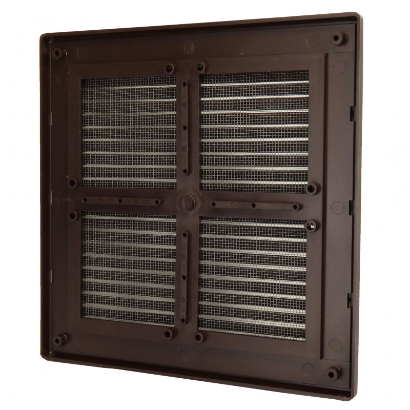 Grila de ventilație din plastic maro cu plasă anti-insecte 204x204 mm fără flanșă este potrivită atât pentru ventilație cât și pentru evacuare. Are jaluzele orizontale fixe cu înclinare.