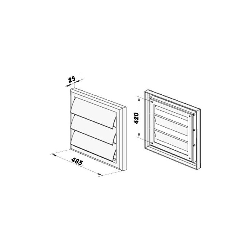 Grila de ventilație 485x485 mm fără flanșă este potrivită atât pentru ventilație cât și pentru evacuare. Grilă de ventilație cu jaluzele gravitaționale (plastic) și corp metalic este tratată cu strat de polimer în culoare albă pentru o mai bună rezistență la condițiile meteorologice externe. Este mai durabilă cu rigiditate mai mare (nu se răsucește). Acest lucru preveni căderea lamelelor din plastic, care în plus se extind peste partea din jos a grilei pentru, a preveni pătrunderea apei în conducte și, să nu provoacă pagube.