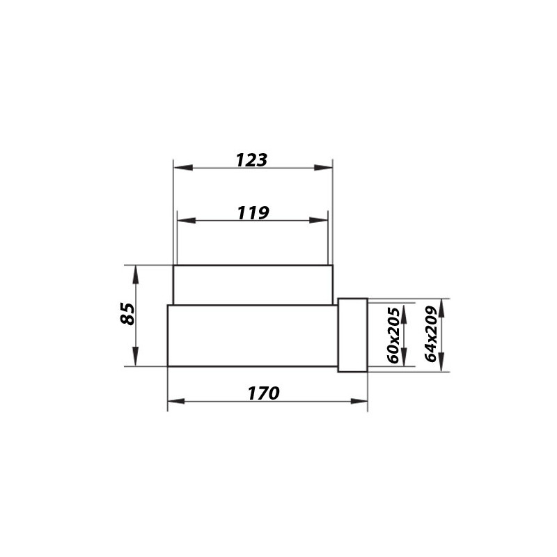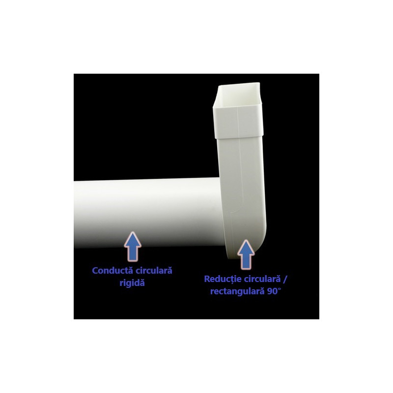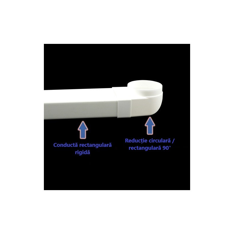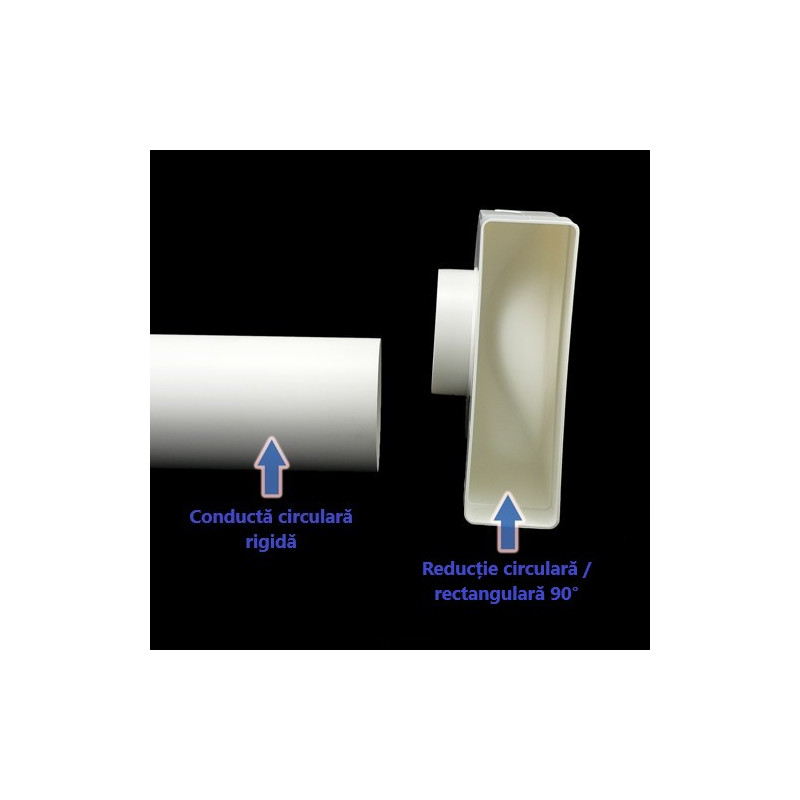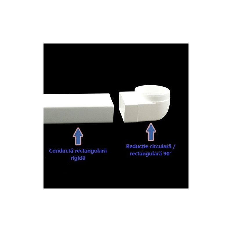 Reducție PVC 90° în formă de cot pentru conectarea conductelor circulare Ø 125 mm și conducte rectangulare 204x60 mm sau a componentelor. Această reducție este cel mai mult utilizată între hote și conducte.