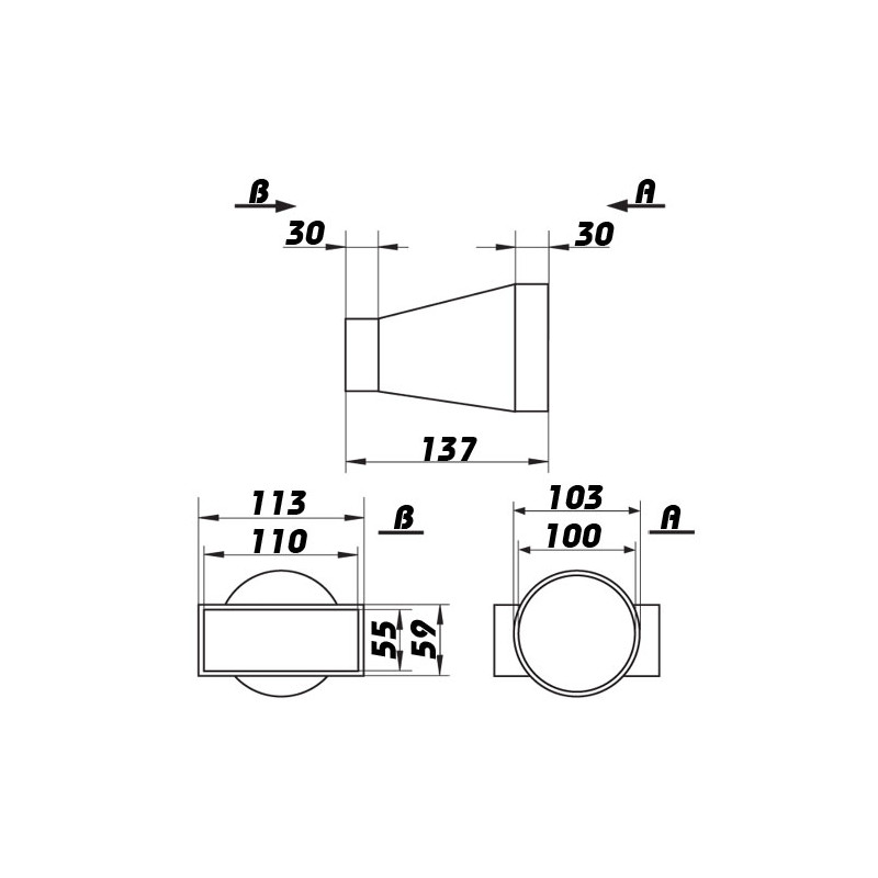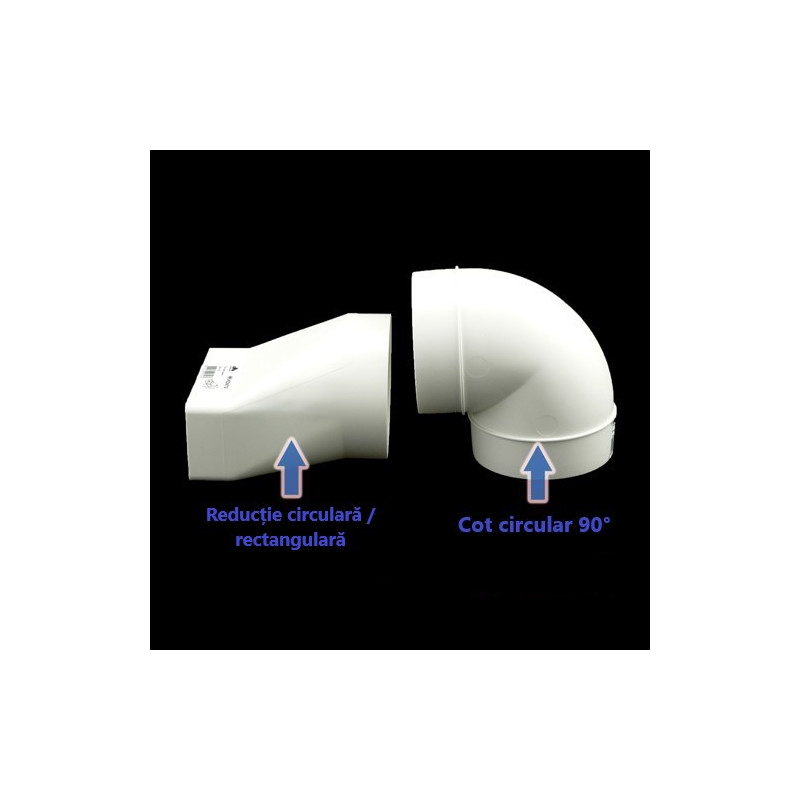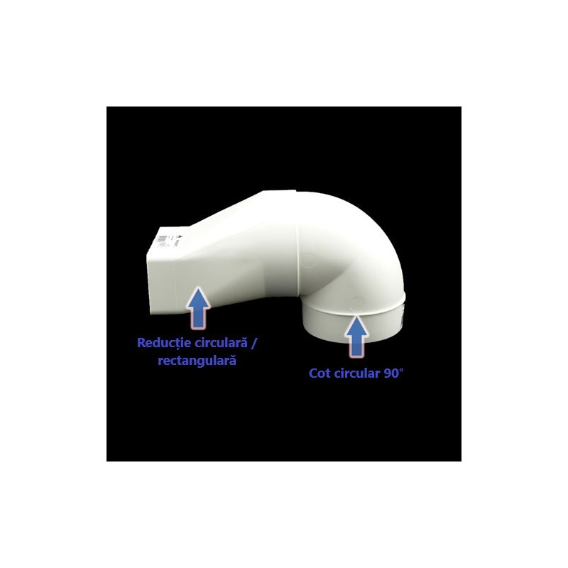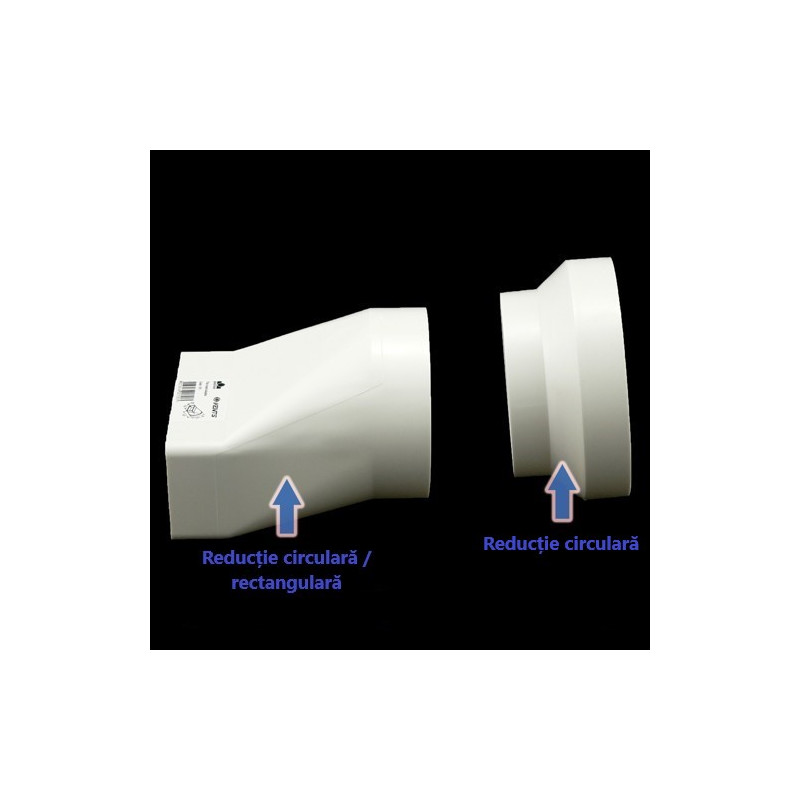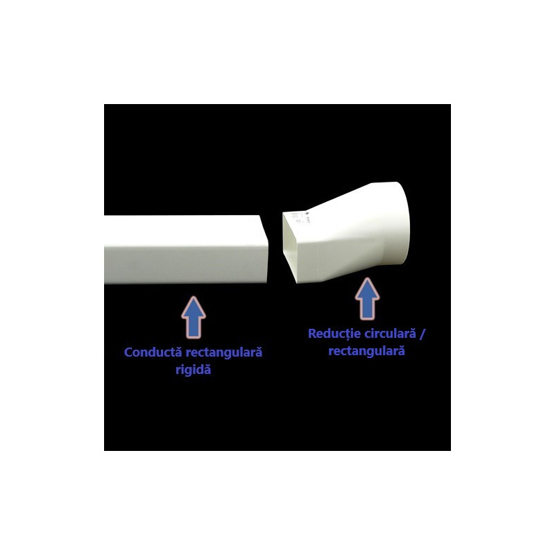 Reducție plastică sau, trecere de la conductă circulară Ø 100 mm la conductă rectangular 110x55 mm. Cel mai mult este folosită între hote și conducte.