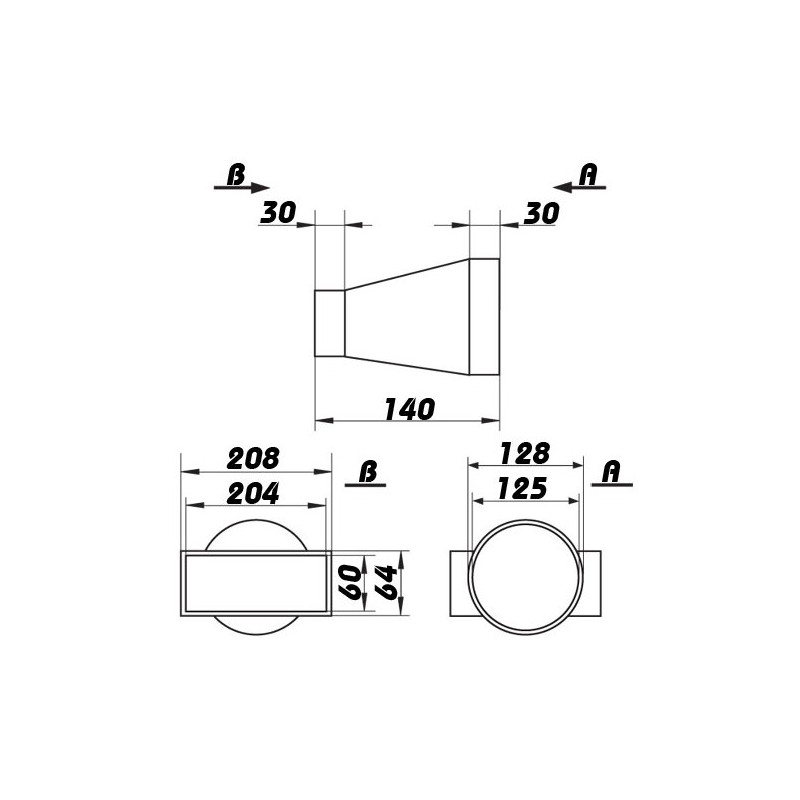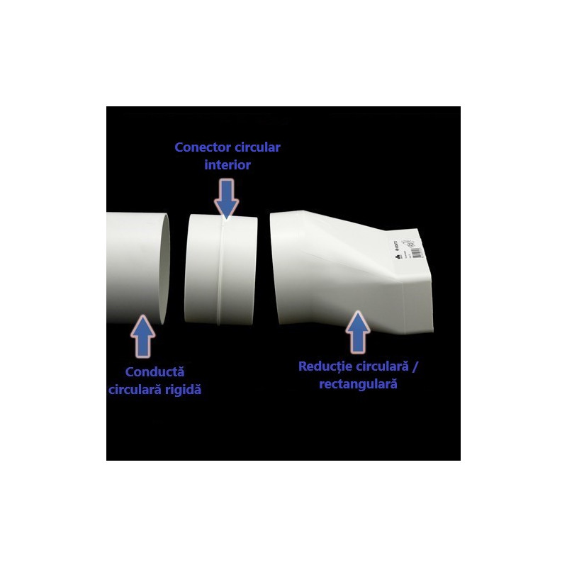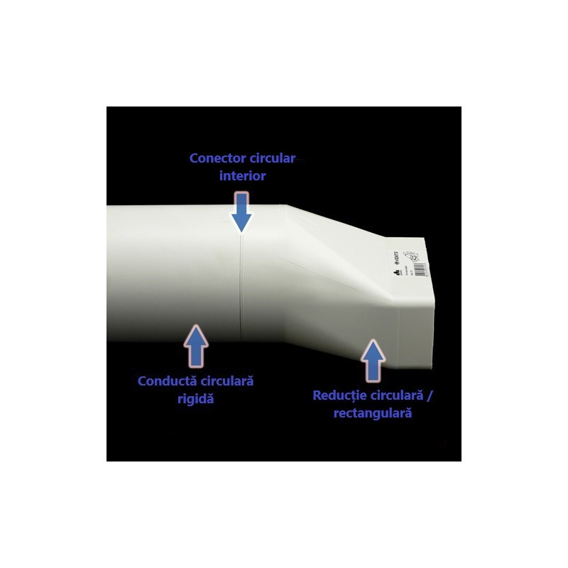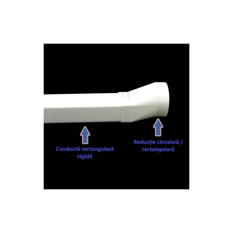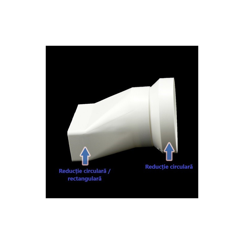 Reducție plastică sau, trecere de la conductă circulară Ø 125 mm la conductă rectangular 204x60 mm. Cel mai mult este folosită între hote și conducte.