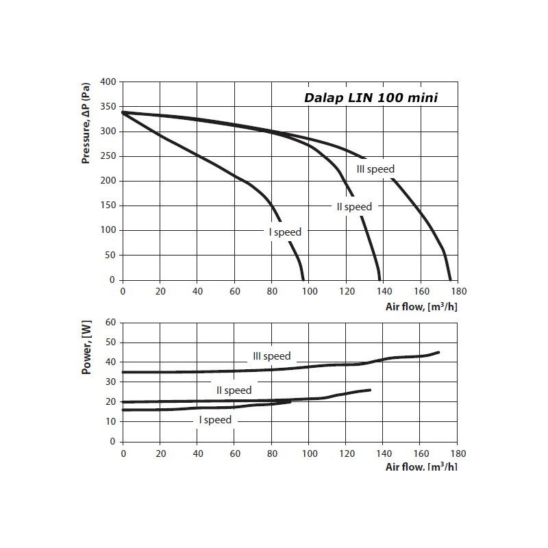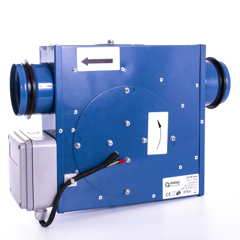 Motor cu trei viteze cu elică radială, care este echipat cu lame curbate înapoi. Motorul ventilatorului este echipat cu rulmenți cu bile pentru o durată de viață lungă (40.000 ore). Ventilatorul Dalap LIN 100 mini poate fi montat pe tavan sau perete atât în conducte rigide, cât și flexibile, menținând puterea motorului neschimbată.