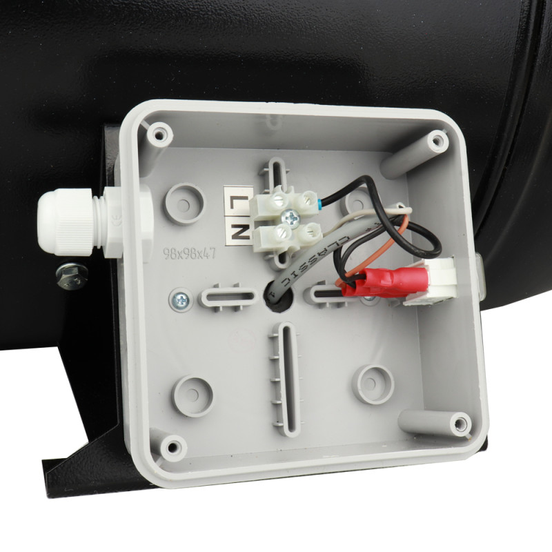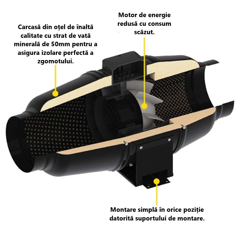 Motorul puternic cu rulmenți cu bile vă permite să montați ventilatorul oriunde la conductă. Dacă trebuie să măriți presiunea sau capacitatea aerului transportat, puteți instala mai multe ventilatoare de tubulatură in-line.